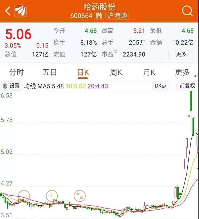 ▲截至发稿,哈药股份股价又下跌到5.06元每股药品疯抢,股价暴涨。蹊跷的是,哈药集团似乎未卜先知。