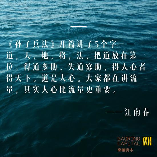“天”是天象、天时,创业者要问问做的事和大趋势是否一致,时间窗口对不对;“地”是渠道、布局;“将”是团队;“法”是运营管理的效率和激励机制。天、地、将、法都无比重要,但中国人打仗把什么放在第一位?把道放在第一位。