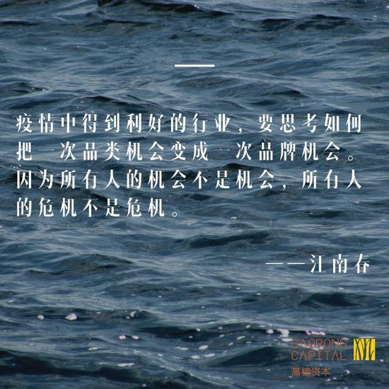 2月23日,在高榕资本榕汇《穿越危机》线上沙龙上,分众传媒创始人、董事长江南春,通过线上视频会议,与高榕超180位投资企业CEO、高管、合作伙伴,分享了在亲历03年非典、08年金融危机和新冠疫情3次危机后的思考,并提炼了3点认知——危机即战机,是非即成败,分化即进化。