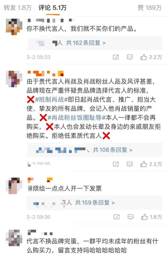 随着事情不断发酵,愤怒的网友开始将矛头对准肖战的商务代言。3月1日,微博话题#抵制肖战#冲上热搜,不少网友列出了肖战代言的全线产品名单,并表示“不会购买任何肖战代言、担任大使、记肖战销量的产品”。随后,各大品牌的社交媒体账号被“抵制肖战”的呼声刷屏,在电商平台购买过肖战相关产品的人纷纷要求退货。随后,主播李佳琦在3月1日晚间的直播中,临时撤下了一款由肖战代言的Olay产品。