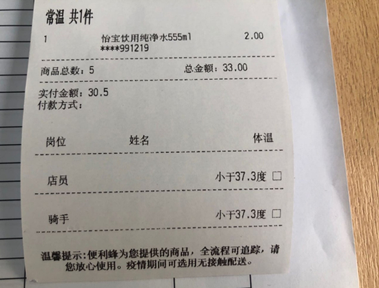 受疫情影响,2020年春节前后百货、餐饮、商超等零售业态大面积关闭,便利蜂却有超过9成门店坚持24小时营业,提供多种家常中式热菜,成为行业翘楚。沈宏非留意到便利蜂恒温水柜里的热菜温度保持在65度以上,外卖单上标注的店员和快递员体温则确保在37.3度以下,这些数字无疑给了消费者一颗定心丸。他忍不住感叹:“便利蜂的食品卫生标准达到甚至超过餐厅,比如公示热餐用油。住家、公司附近有这种神奇便利店的话,一日三餐几乎都能在此搞定。”