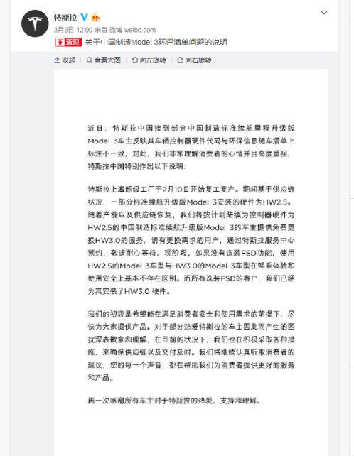 3月3日,特斯拉在其官方微博上发布声明,承认确实存在“减配”交付的情况,国产Model 3使用HW2.5是由于复工后供应链问题;目前已提车的国产车车主,只要是HW2.5的用户,都可以预约更换为HW3.0。