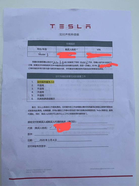 有参与维权的国产特斯拉车主于3月5日向《中国经济周刊》记者反映,特斯拉让他们在提车前签署“交付声明和借据”,上面写着“前述收据您确认已于2020年3月4日或之前接受了您的Model 3汽车,您确认该汽车与您所下订单、发票及交车其他相关文件中描述和定价的车辆完全相符。您进一步确认,对订单所做的所有付款均是代表您所做的付款,并同意该车辆的损失风险自此时转移至您承担。”