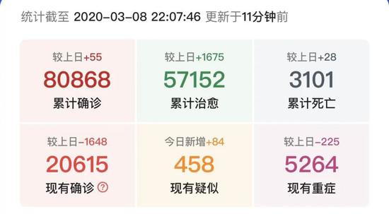 今天疫情数据继续向好,确诊新增55例,疑似新增84例。其中武汉新增41例,其他省市地区中香港占了7例。