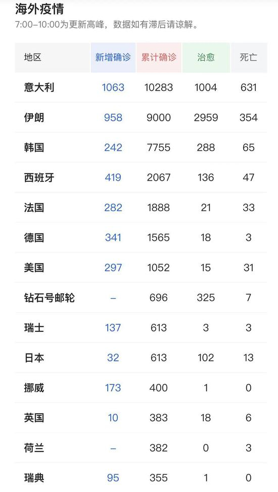 全球疫情病例依然在快速增长,总数已经到了40488例。意大利突破1万例,伊朗9000例,韩国7755例。西班牙、法国、德国都不乐观(数据见上图),美国达到了1052例。意大利医疗资源紧张,开始建议对重症监护病房设定年龄限制。一位医生说:“我们不得不在40岁的病人和60岁的病人之间选择……这太残酷了,我们都哭了,但我们没有足够的呼吸机。”