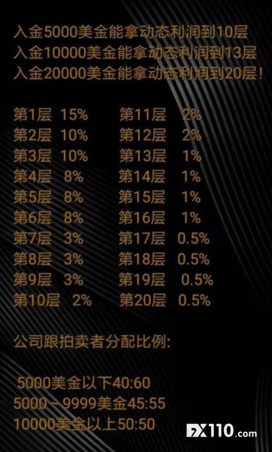 我们先来看看投资者在平台的盈利模式:星钻科技有一套人员层级制度,层级有普通会员、代理、钻石经纪人等,这种层级制度基于拉人头和多级抽层。比如,钻石经纪人下面有20层人员,代理下面有10层人员;钻石经纪人可以享受提成奖励,可从手下第一层人员那里抽取15%的提成,从第二层抽取10%等。不过,要成为钻石经纪人的条件,是要么在平台上保持最少2万美金的资金,要么培养3组高级代理,市场众筹拍卖投资总金额达到8万美金。