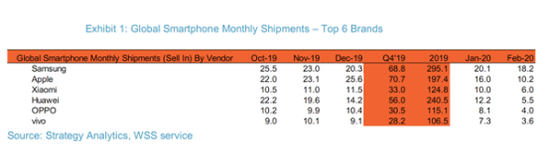 按照Strategy Anaylytics的说法,2020年2月全球智能手机总出货量6200万部,同比减少38%,环比减少39%,销售量为6500万部。
