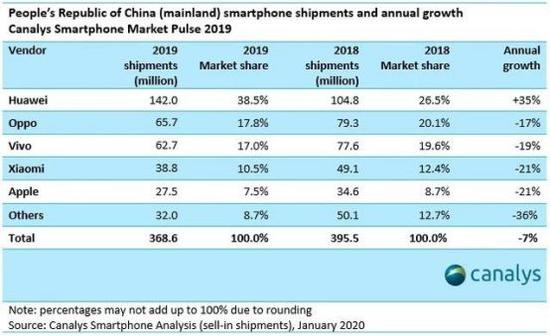 国际市场研究机构Canalys发布的数据显示,2019年的手机市场并不乐观。总体来看,2019年全年,中国智能手机销量为3.69亿部,同比下滑7%。与此同时,仅2019年第四季度,中国智能手机的销量就同比萎缩了15%,为8530万部。
