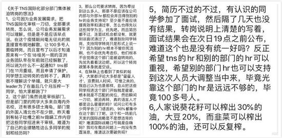 对方披露了更多细节:公司因为业务发展需求,把TNS国际化审核一刀切,可以理解,但在疫情期间毫无征兆的就直接宣布就地解散,让100多号人面临转岗。而且宣布了以后才知道,原来有一个在18楼另一层的亚洲业务团队早在年前就已经解散了,为什么不一起通知?