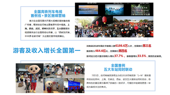“想家到河南”高铁电视策划创高铁营销三个第一,品牌传播给河南带来了丰盈的回报:按河南省2018年国庆节旅客人数6186.6万人次,全国排行第三名,旅游收入464.6亿元,全国排行第四名,按可比口径计算分别收入增长37.7% 、旅客量增长33.5%,双创历史新高,增长量居全国第一。