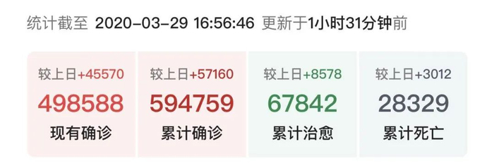 我上一次发日记是3月24日,那天海外的确诊人数是311621人。仅仅四天半后的今天,确诊人数已经攀升到了594759人,去世人数达到了28329人。美国确诊人数上升最快,总数达到了124676人。意大利确诊92472人,去世人数达到10023人。即使是这样,我觉得世界的疫情还没有进入失控状态。如果从现在起,那些疫情非常严重的国家,老百姓真的能够待在家里不出来,形势应该会向好的方面发展。