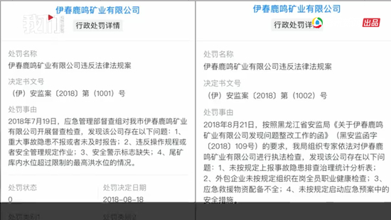 另据天眼查,2018年,应急管理部对鹿鸣矿业公司督查检查时,发现该公司存在重大事故隐患不报或未及时报告;尾矿库内水位超过限制的最高洪水位等情况,伊春市安监局曾对其处以13.96万元的处罚。