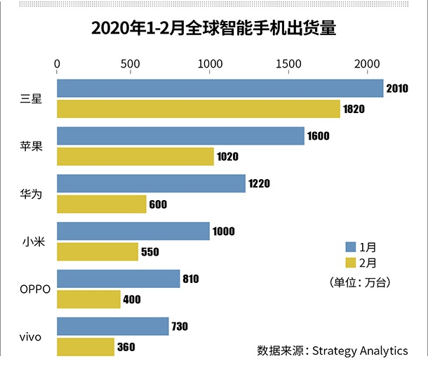 3月20日,Strategy Analytics发布的2月份全球智能手机报告显示,2月份全球市场整体出货量同比下降38%,华为出货量、销量分别同比下降69%和60%,从榜单第2跌至第4。