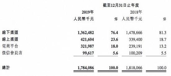 截至2019年12月31日,其线下专柜的销售为人民币13.62亿元,较2018年同期下降7.9%;在线渠道(包含电商平台和自营微信商城平台)的销售为4.21亿元,较2018年同期上升24.2%。其中,电商平台的销售为3.22亿元,较2018年同期上升34.6%。
