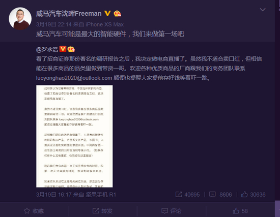 威马汽车创始人、董事长兼CEO沈晖更是亲自下场,在微博公开“示好”罗永浩。