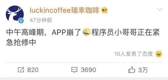 当日午后,瑞幸咖啡通过官微回复,“中午高峰期,APP崩了,程序员小哥哥正在紧急抢修中。”