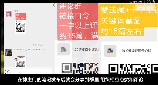 在这种逻辑下,大量小 V 和素人博主被投放时其实并没有转化指标,所以也就全不在乎内容的质量,她们要做的只是:让自己的数据相对好看,完成“陪跑”霸屏的任务。 于是,小红书社区内就衍生出了规模庞大的笔记代写、刷量灰产。 比如,这些“陪跑”的博主们会自发抱团组成一个个“互相刷赞群”。群里每天会有博主发当天的“群作业”,然后大家一起互相刷点赞、评论。