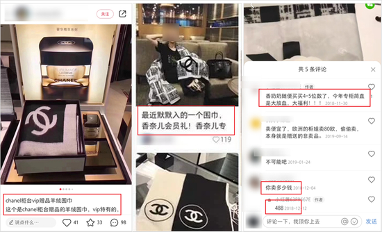 除了豪车外,还有像 LV 、爱马仕等奢侈品都被微商们用来打造自己“有钱+励志”人设,然后再通过其他笔记来卖假货。 比如之前,就有微商打着“专柜 VIP 赠品围巾”来卖假货。按照她们的说法,围巾只能在国外专柜购买,且必须是大会员们才有资格拿到。 原价都是大几千甚至上万,但在评论区作者却回复:488 就能代购。 在豪富人设 + 稀缺品带来的虚荣心作用下,这种“瞎眼可见”的微商套路依旧有不少用户会上当,很多笔记下面都有求代购的留言。