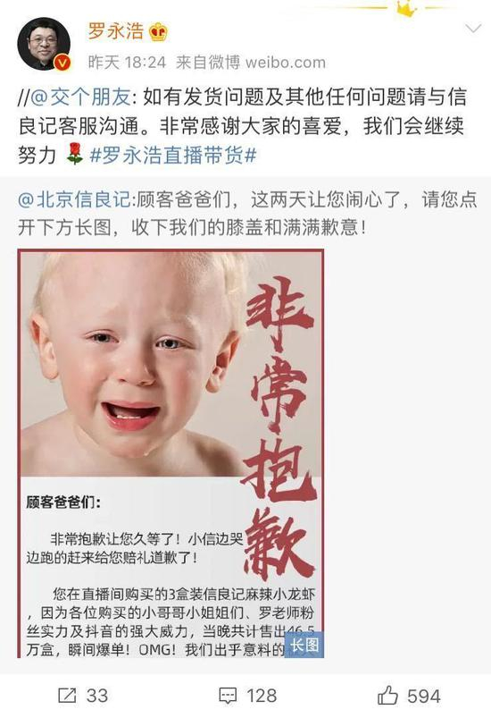 发现问题后,信良记第一时间就找了抖音和罗永浩团队沟通,随后在微博上做了道歉声明。对于愿意等待的消费者,信良记承诺一周之内一定到货,并会提供优惠券作为补偿,对于不愿意等待的消费者,也第一时间做了退款处理。