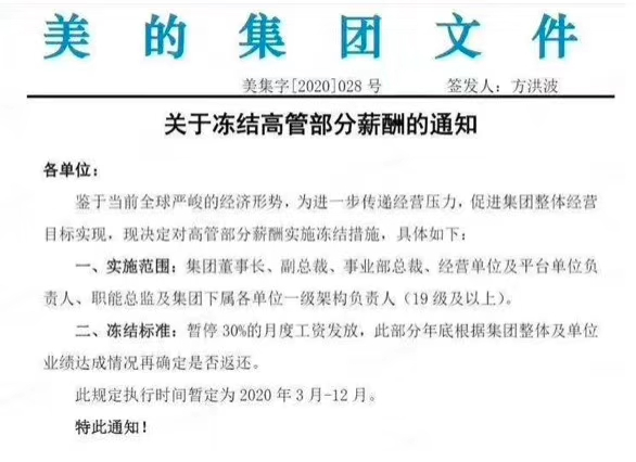 根据文件,鉴于当前全球严峻的经济形势,为进一步传递经营压力,促使集团整体经营目标实现,决定对高管部分薪酬实施冻结措施。具体冻结标准为,美的集团暂停高管30%月度工资的发放,该部分薪酬将于年底据集团整体及单位业绩达成情况,再决定是否返还。该规定的执行时间暂定为2020年3月至12月。