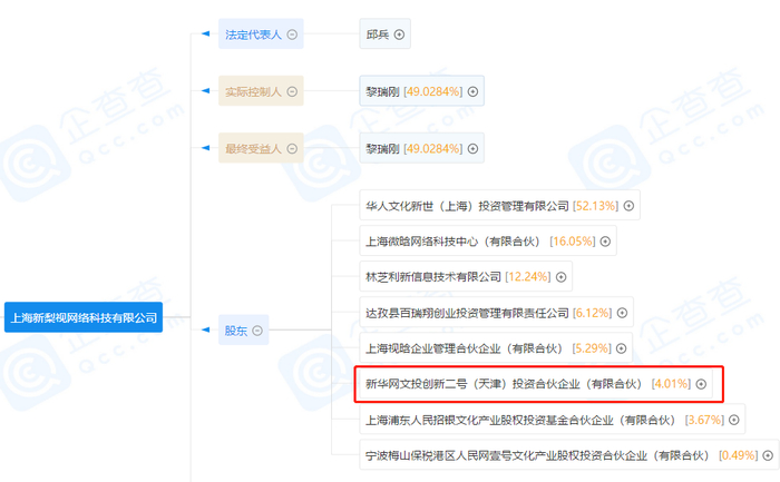 相关资料显示,2020年3月31日,新华网文投创新二号(天津)投资合伙企业已成为梨视频梨运营主体公司——上海新梨视网络科技有限公司股东,持股权比例为4.01%。
