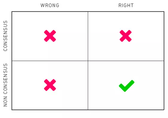 所以赚大钱的唯一方式是:你是对的且与众不同。但这很难,因为当你投资时,你只知道你和别人不一样,但你不清楚自己是对还是错。