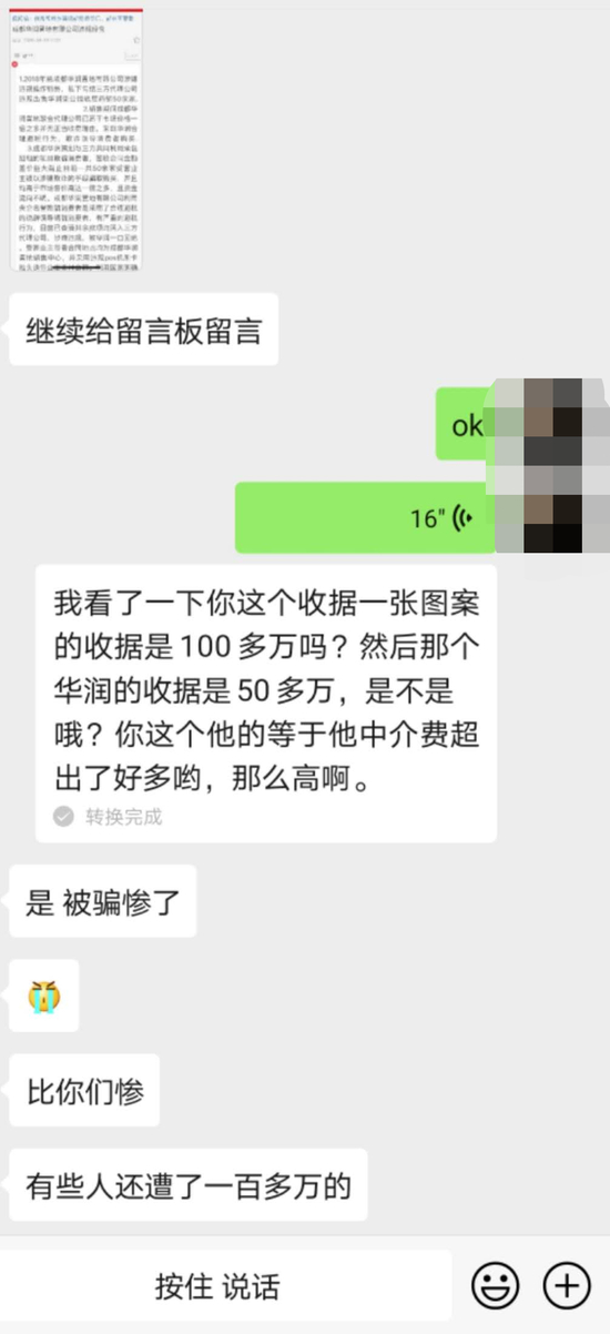△聊天截图,销售人员自称为华润置业顾问。(图片由业主提供)