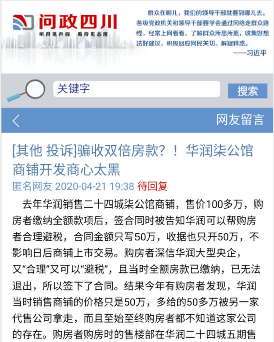 刘女士等业主将自己的情况反映到了成都市长信箱及四川省长信箱,他们在留言板中反馈称:有50多户购房者,都支付了双倍房款,其中最少的购房者多给了50多万,最多的购房者多给了上百万,有甚者多支付的那部分更是超出了实际房款。多收房款金额巨大,数千万房款不知所踪,华润并没有把这笔巨款计入任何合同。购房者咨询律师说这是那家中介公司不当得利,华润也有连带责任并且涉嫌巨额偷税漏税。