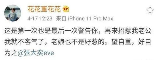 2020年4月14日,网名“花花董花花”的一位女士在微博上发文喊话电商网红、如涵公司首席市场官张大奕,让其别招惹自己的老公,否则就不客气了。有网友迅速表示,“花花董花花”是蒋凡的夫人,且为蒋凡育有一儿一女。