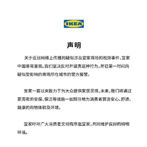 宜家官方微博5月9日发布的信息称:关于近日网络上传播的疑似涉及宜家商场的视频事件,宜家中国非常重视。宜家坚决反对并谴责这种行为,并已第一时间向疑似受影响的商场所在城市的警方报警。宜家致力于为大众提供家居灵感,营造安心、舒适、健康的购物体验及环境,呼吁广大消费者文明有序逛宜家,共同维护良好的购物环境。