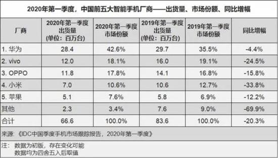 据IDC的数据,华为手机今年一季度、2019年一季度的全球出货量分别为4918万、5910,国内出货量分别为2840万和2708万。