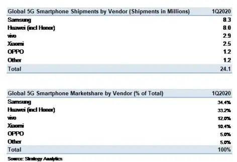 据Strategy Analytics数据显示,从全球5G智能手机出货量来看,排名前五的智能手机厂商是三星(市场份额34.4%)、华为(包含荣耀,33.2%)、vivo(12%)、小米(10.4%)和OPPO(5%)。