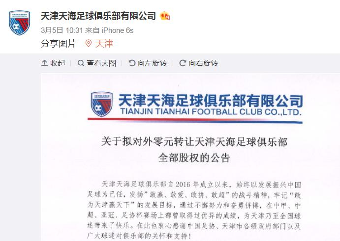 但此后,天津天海的生存状态仍不尽人意。今年3月5日,天津天海发布公告称,俱乐部难以维持球队整个赛季的正常运营,即日起对外招募合适的转让对象,将以0元转让费的方式转让俱乐部100%股权,转让截止期限为3月14日。
