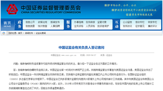 这也是证监会再度发声的背景。中国证监会表示,自瑞幸咖啡自曝财务造假以来,中国证监会第一时间对外表明严正立场,并就跨境监管合作事宜与美国证监会沟通,美国证监会作出了积极回应。一向对跨境监管合作持积极态度,支持境外证券监管机构查处其辖区内上市公司财务造假行为。