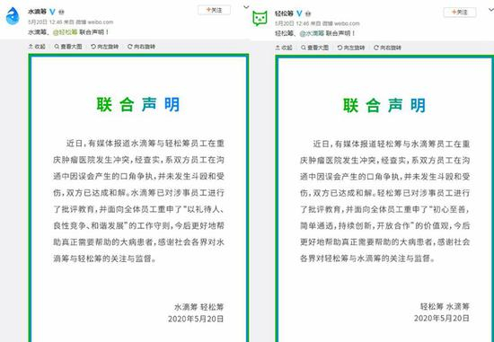 5月20日,水滴筹、轻松筹在双方官方微博发布了联合声明。声明中称,媒体报道水滴筹和轻松筹员工在重庆肿瘤医院发生冲突,经查实,系双方员工在沟通中因误会产生口角争执,未发生斗殴和受伤,双方已达成和解。