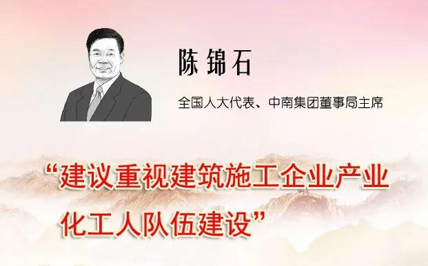 全国人大代表、中南集团董事局主席陈锦石向大会提交了4份建议,内容主要涉及:重视加强建筑施工企业产业化工人队伍建设;不断完善预制装配式建筑产业管理体系,推动预制装配式建筑产业更好发展;高层建筑强制使用钢结构,增强建筑安全性;进一步支持环保与节能产业发展等。