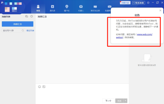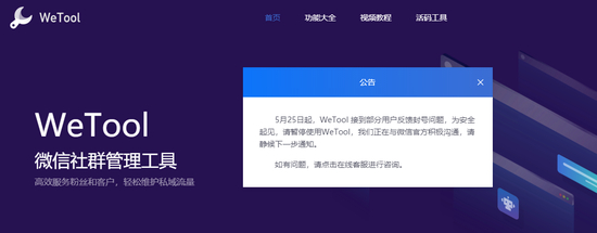 紧接着,WeTool方面也发布官方公告称:“5月25日起,WeTool接到部分用户反馈封号问题,为安全起见,请暂停使用WeTool,我们正在与微信官方积极沟通,请静候下一步通知。”
