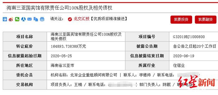 据北京产权交易所公告,三亚悦榕庄持有人为海南三亚国宾馆有限责任公司(下称“三亚国宾馆”),三亚国宾馆2019年营业收入为3984.55万元,净利润为亏损9101.83万元。2020年1-4月,受疫情影响营业收入833.26万元,亏损1879.82万元。