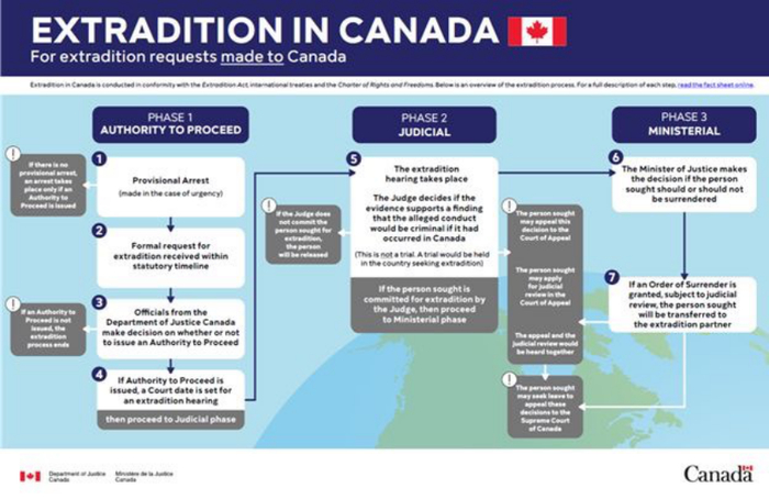 5.引渡庭审:最终,引渡案件法官将会决定,是否继续涉及被告的引渡程序。在初审裁决后,被告也可以针对审判结果上诉,并最高可以上诉至加拿大最高法院。(编者注:最新的阶段即是此阶段)