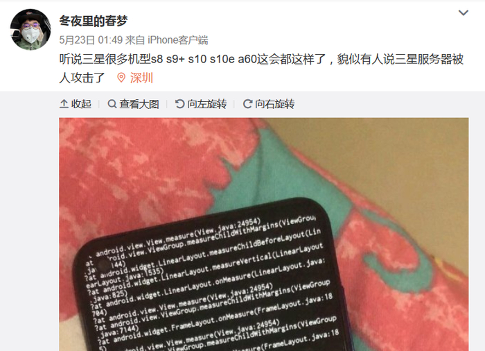本周,一些网友在微博等社交平台分享了他们的遭遇,其三星手机突然黑屏崩溃,有时还会导致显示乱码,或者无限重启并锁定在重启程序中。一位三星手机用户告诉新京报记者,其在三星线下销售渠道发现,柜台上的展示样机也出现了大面积黑屏,无法使用的现象。