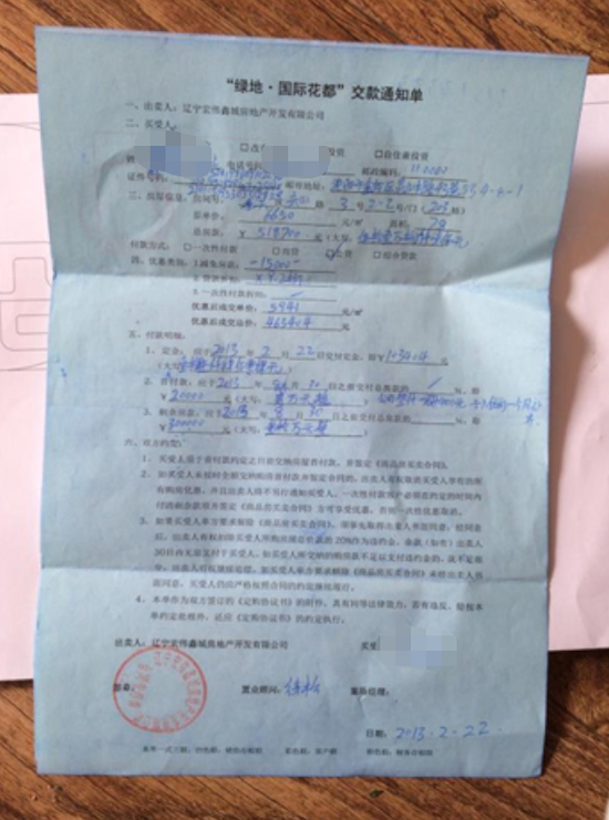 2013年2月,位于沈阳市于洪区赤山路55号的绿地国际花都项目公开预售,吸引了大批购房者。基于对项目认可,购房业主与辽宁宏伟鑫城房地产开发有限公司(以下简称“辽宁宏伟鑫城”)签订了订购协议,并交纳了定金,开发商承诺2014年10月交房。