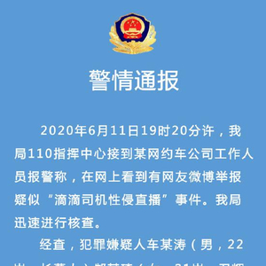 警方通报疑似滴滴司机直播性侵事件:视频中两人为夫妻关系