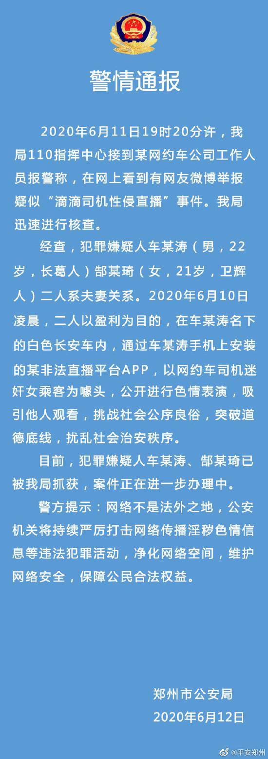 新浪科技讯 6月12日晚间消息,郑州市公安局发布微博通报网传滴滴司机直播性侵事件。