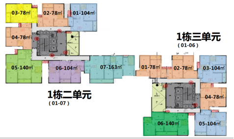 户型分别有80平的两室两厅一卫、110平的三室两厅两卫、140平的四室两厅两卫、163平的四室两厅两卫的类住宅公寓,目前均已封顶。梯户比为3梯7户和4梯8户,为典型的公寓配置。