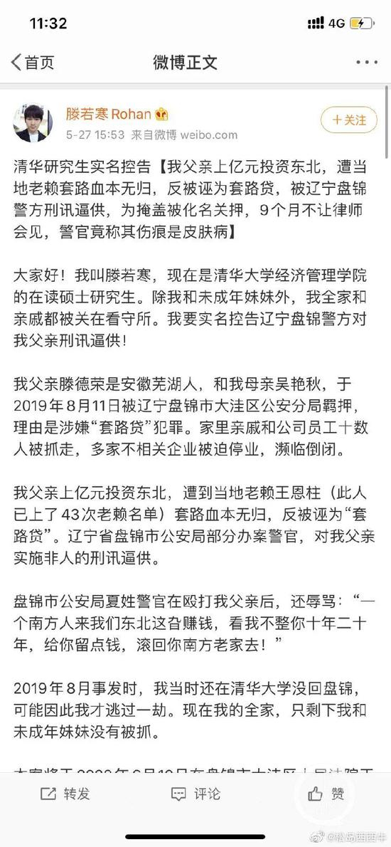 日前,自称清华大学经管学院在读研究生的滕若寒在微博上实名控告称,其父滕德荣在东北投资上亿元,遭遇老赖套路血本无归,反被诬陷为“套路贷”,除自己和未成年的妹妹外,全家都被控制。