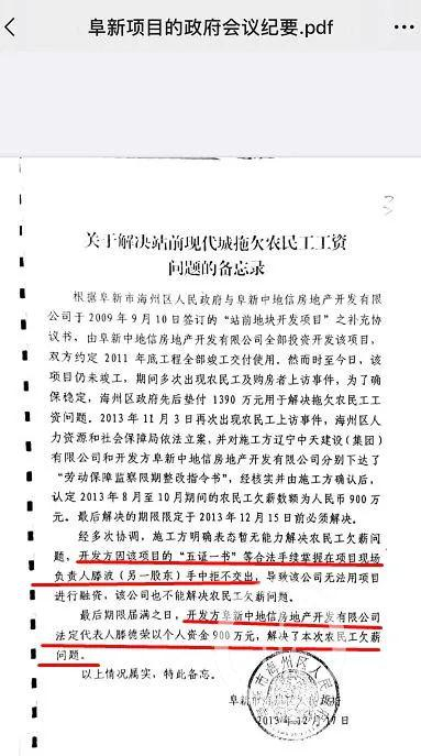 政府会议纪要显示,滕德荣与盘锦本地人滕波曾发生纠纷,滕德荣个人出资900万元,解决农民工欠薪问题。/受访者供图