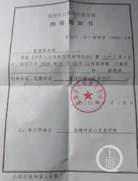 今年1月,盘锦市公安局大洼区分局的拘留通知书显示,滕德荣涉嫌诈骗罪被刑拘。/受访者供图