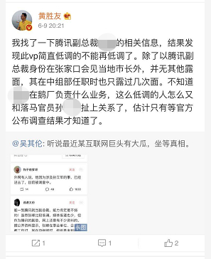 之后,微博认证大V,知名军事博主、中国民俗摄影协会会士黄胜友转发后说:我找了一下腾讯副总裁XXX的相关信息,结果发现此vp简直低调的不能再低调了....不知道张总在鹅厂负责什么业务,这么低调的人怎么又和落马官员xxx扯上关系了,估计只有等官方公布调查结果才知道了。