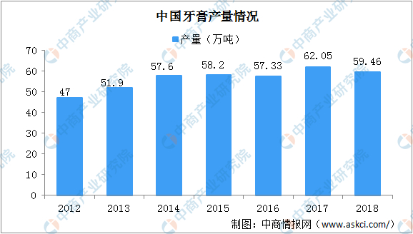 据中商情报网,近年来中国牙膏产量始终维持在50万吨以上,2018年中国牙膏产量达59.46万吨,行业整体产量下降。