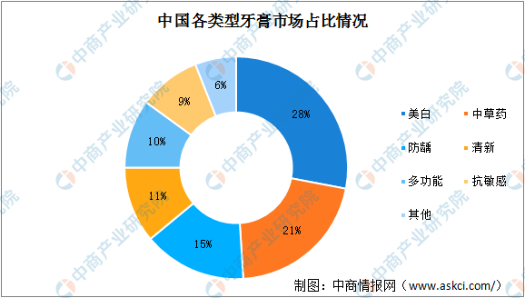 从我国各类型牙膏细分市场来看,美白功能的牙膏市场占比最大,达到了28%,主要原因是大多数消费者对于牙膏的功能首先考虑的是美白效果,同时消费新生代比起其他群体更关注美白。其次是中草药类型的牙膏,占比达到了21%,因为中草药配方的宣传深入人心,更多人愿意相信中草药的功能。